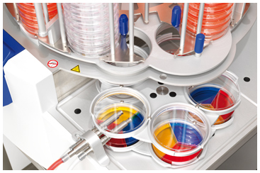 分裝系統(tǒng)可用于精確定量分裝培養(yǎng)基至直徑為 90 mm、 60 mm 和 35 mm 等各種規(guī)格的平皿,也可用于分裝至雙分格及三分格平皿。